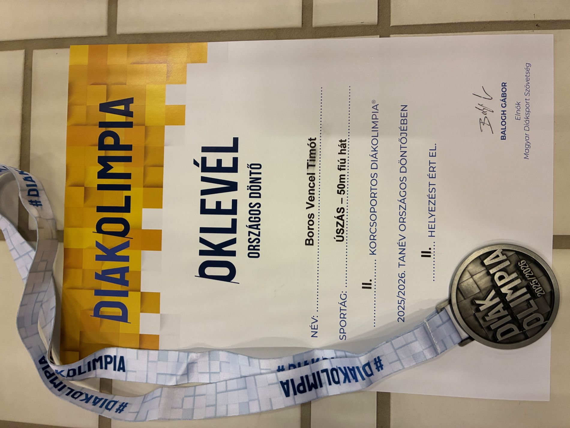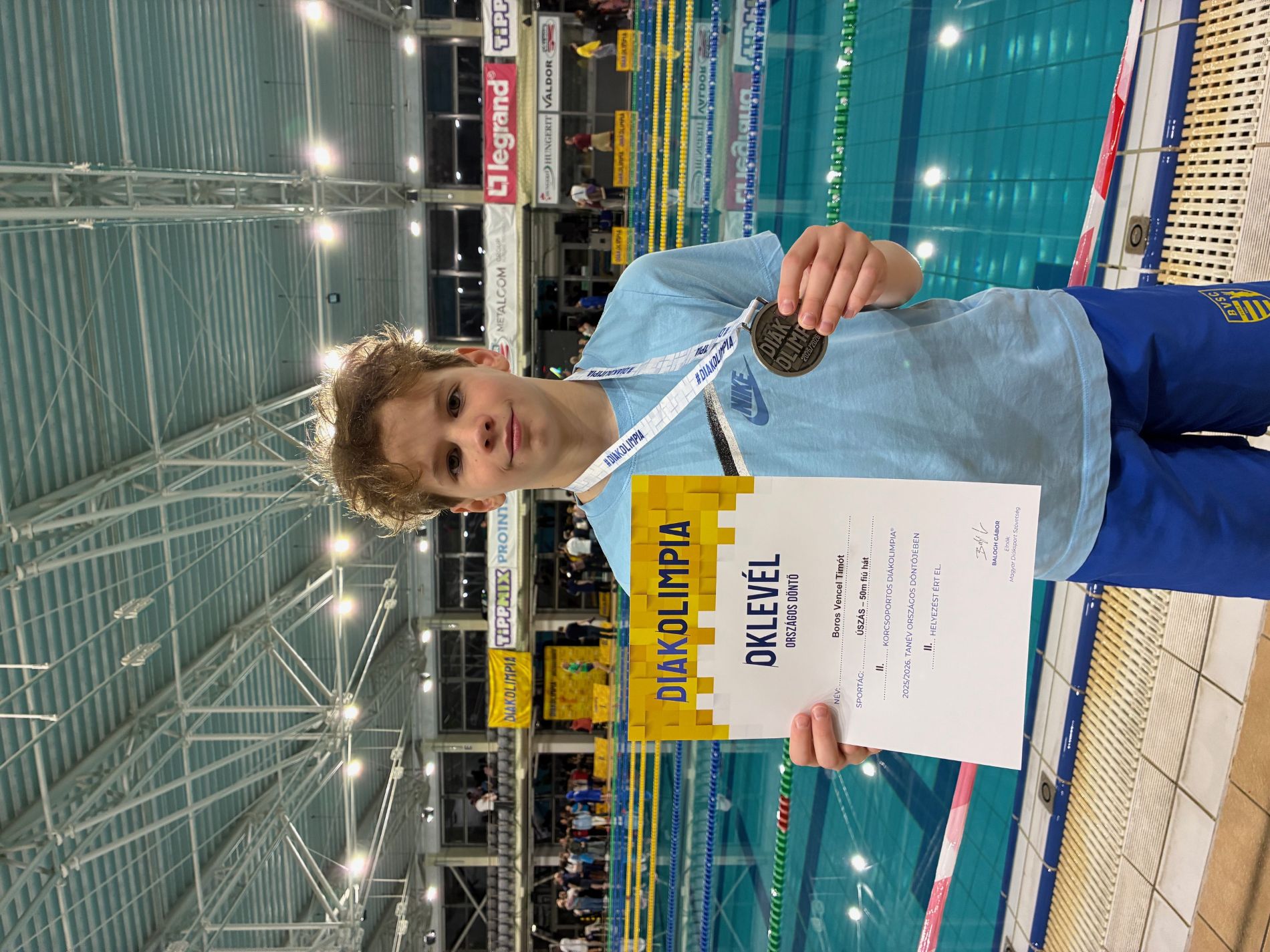 Boros Vencel Timót, iskolánk 4. osztályos tanulója a II. korcsoportban képviselte intézményünket az úszó Diákolimpia Országos Döntőjén, amelyet 2026. március 28-án rendeztek meg Szentesen.